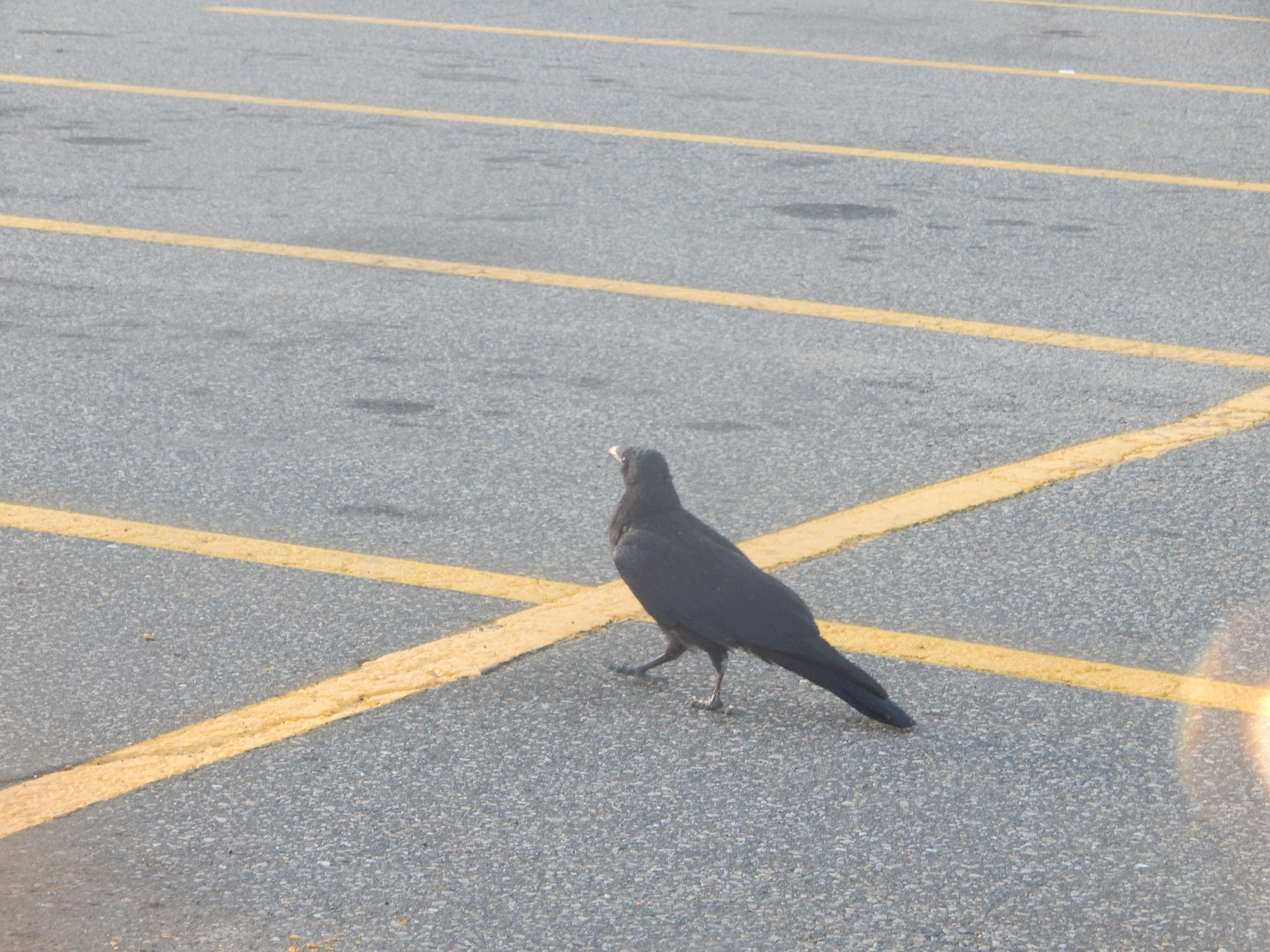 With everything we needed in our shopping cart we paid and went back to the car. Fran took some time to go to the washroom and so me and Laila went ahead with what we bought. There was a big raven that just pooped on some chairs from the edge of Wallmart’s roof. After that it flew right close to us and I could get some shots.