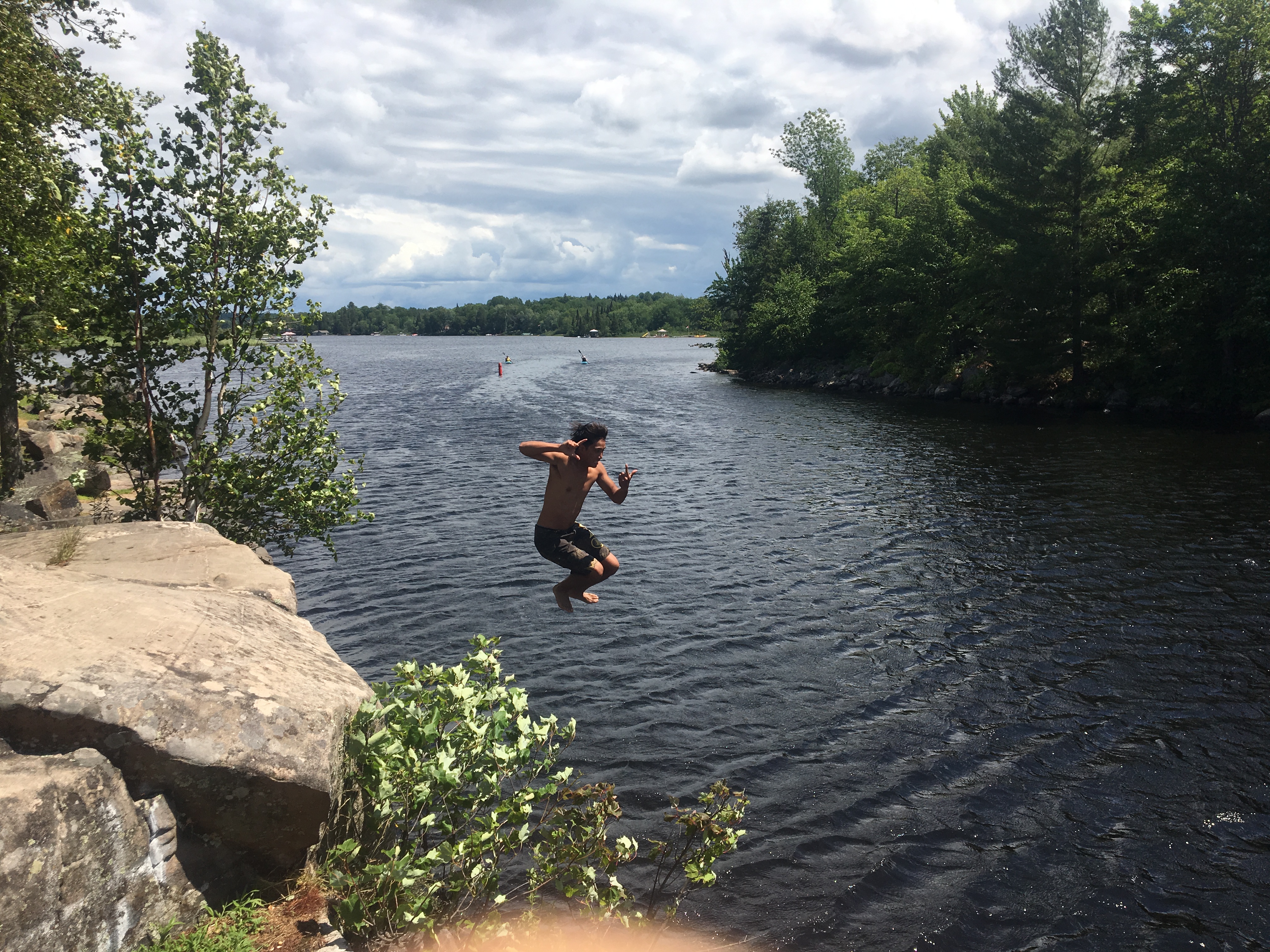 Jim suggested that we should have jumped off one cliff into the water. I went first and tried to make a double L with my fingers to show something that could recall the Lighthouse Lading Camp. After me, Laila jumped with a scream to get rid of the anxiety of jumping from ten meters. Bettina did it with her son River. At first it seemed like he was okay, but he must have been scared because he started crying on a rock after getting out from the water. The last one to jump was Melissa. And it was so cute because Haven kept telling her mom not to dive.