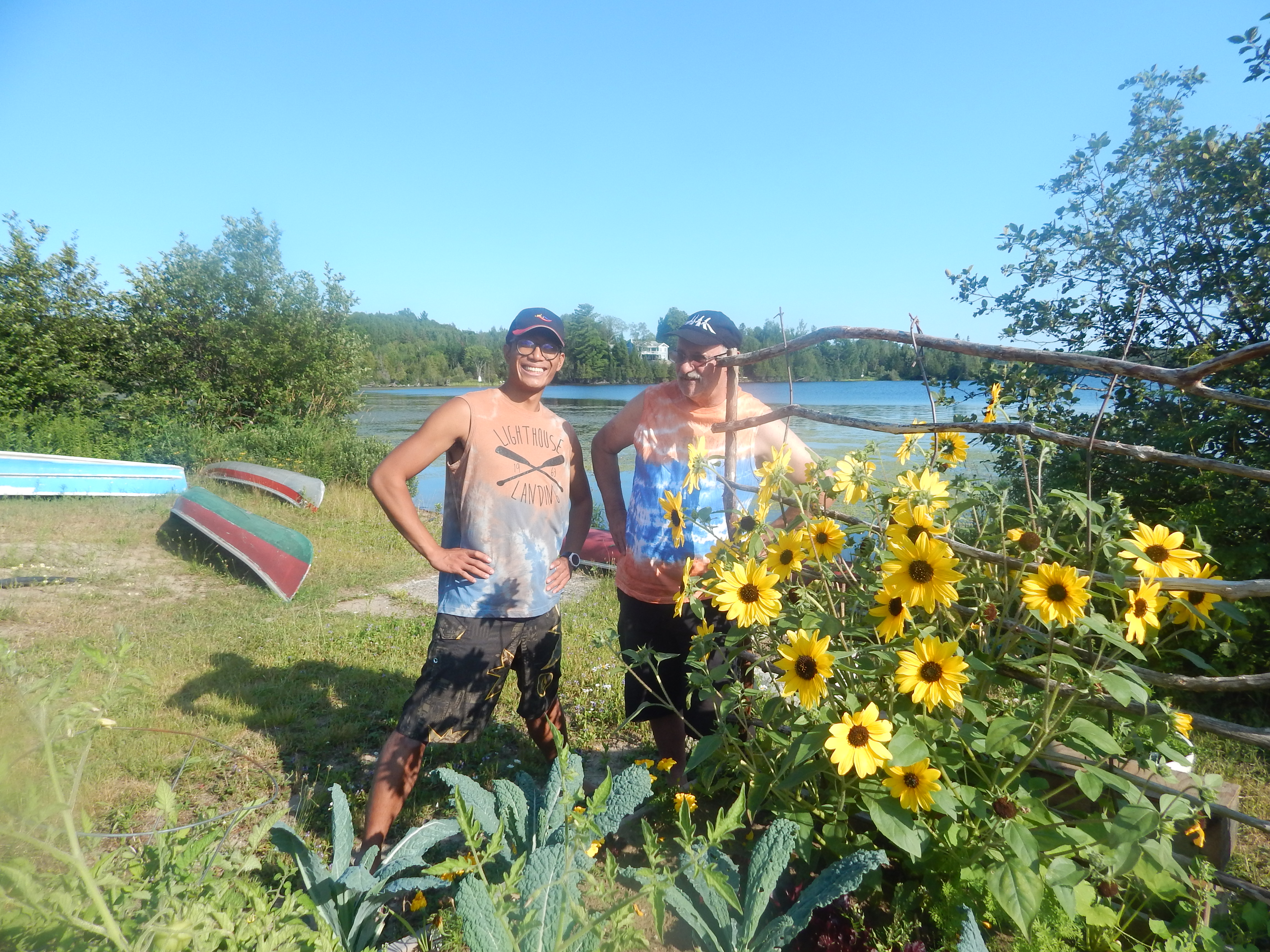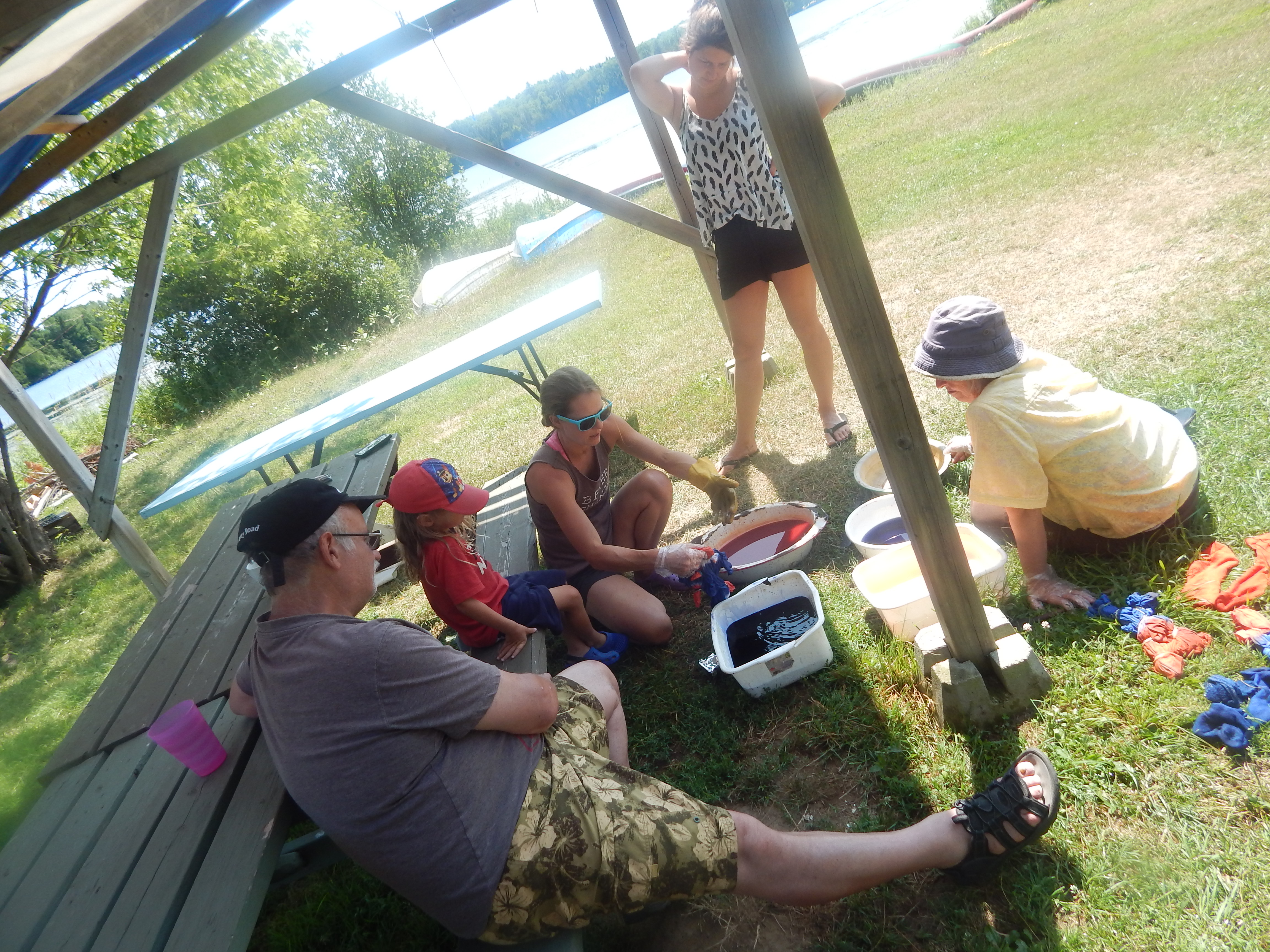 After lunch I offered to help with the cabin but Jim and Fran told me to enjoy the activities because bringing energy and helping out during those moments is part of volunteering too. So I joined the tie-dye and got helped by Asher. He explained me what I should have done but I was afraid of messing up until Laila told me “There are no mistakes while tie-dying”. Nodding at those words I just let my creativity flow. Tie-dye is basically getting chunks of the garment you want to color and then tie the different parts with elastics. I admit I was a little bit worried because my t-shirt looked so different from the others. When it came to actually color it we chose dark blue and orange. I went for a Barcelona uniform type of color mix and I am so glad it came out so cool. The sleeveless shirt Fran gave me to tie-dye was gray with a Lighthouse Landing Camp logo on the chest. After the tie-dye it looked like a a sky during the sunset. It was so wonderful.