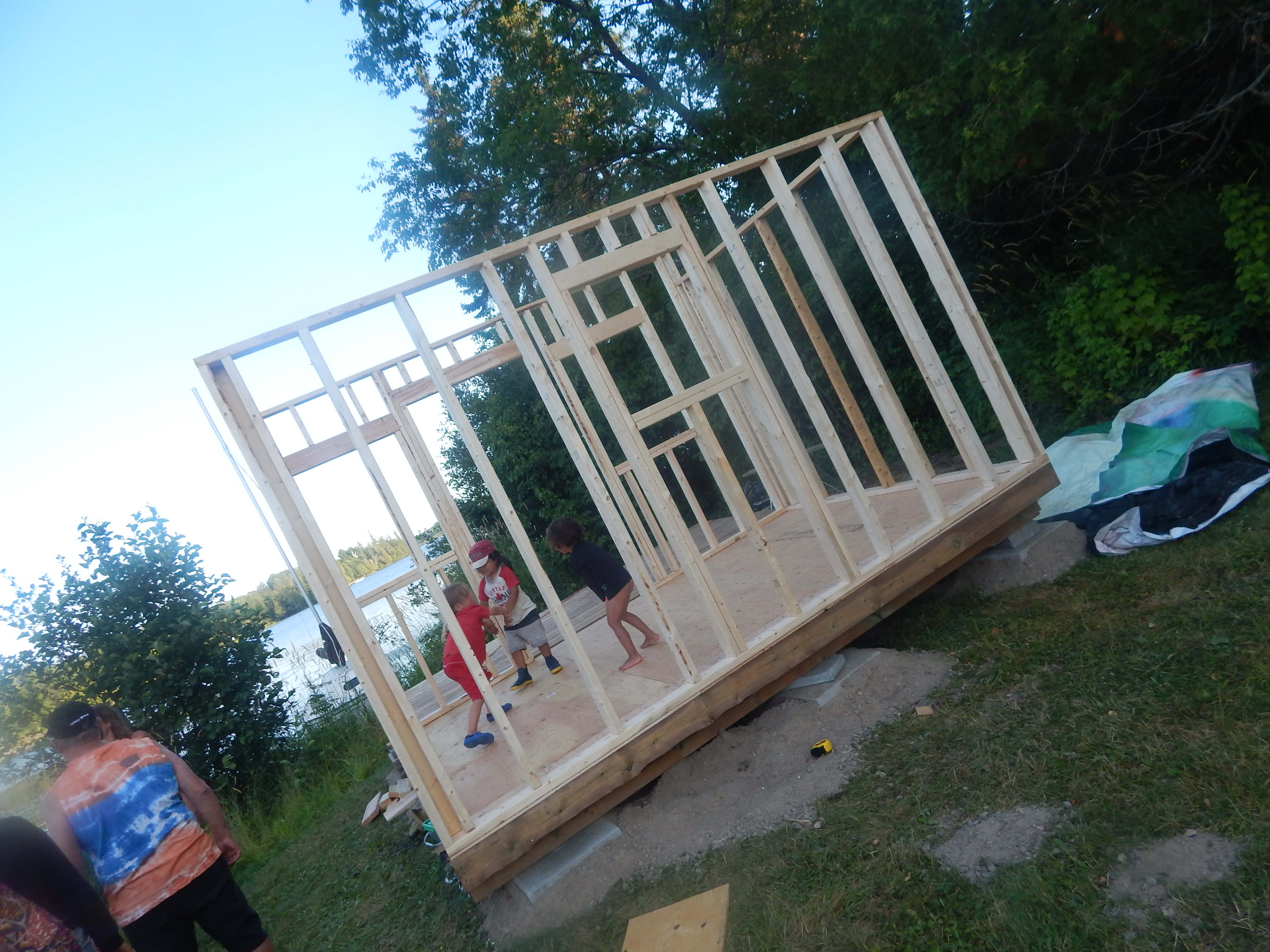 Once we got to the shore I wanted to help Jim with the cabin, but all of my stuff was on Fran’s canoe including my glasses. Since they were still so far, I decided to help Jim anyway with my bad eyesight. I just helped him to line up the planks while he was nailing or drilling them. However, when Fran came to give me back my things, me and Laila started to help more seriously. And I have to admit that we did not slow down Jim this time. We worked so much faster that a building company could have hired us in another life. Jokes aside, we did a pretty well done job for being amateurs. Even though Laila has worked in construction before since she built wood igloos in Sweden. The competitive side of me could not accept that she was better than me with the tools, but I understood that I had a handicap. We finished framing the walls before supper (which is the way they call dinner over here) and we were so excited because it looked so cool already.